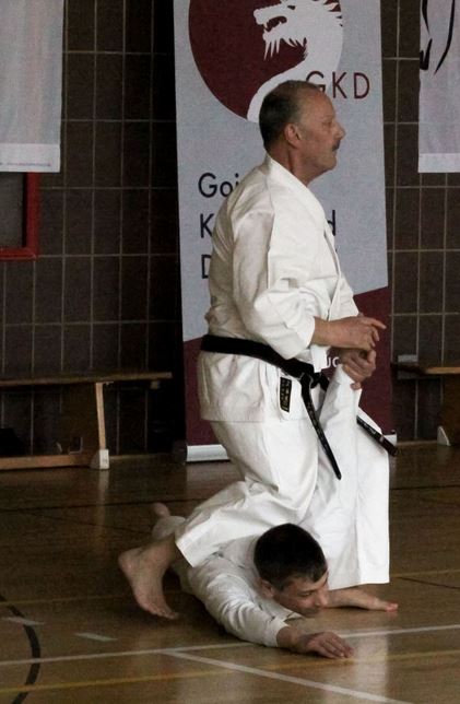 Anschließend zerlegte Paul Stock (6. Dan) die Kata in kurze Verteidigungs-Szenarien. Filigran analysierte er jede Bewegung. Präzise und gleichzeitig spielerisch leicht greift er Schwachpunkte des Gegners an. Hier etwas drücken, da ein Schlag oder Hebel. Autsch! Keine Hektik. Keine Bewegung ohne Schmerz. Ökonomie als Maxime der Kampfkunst.